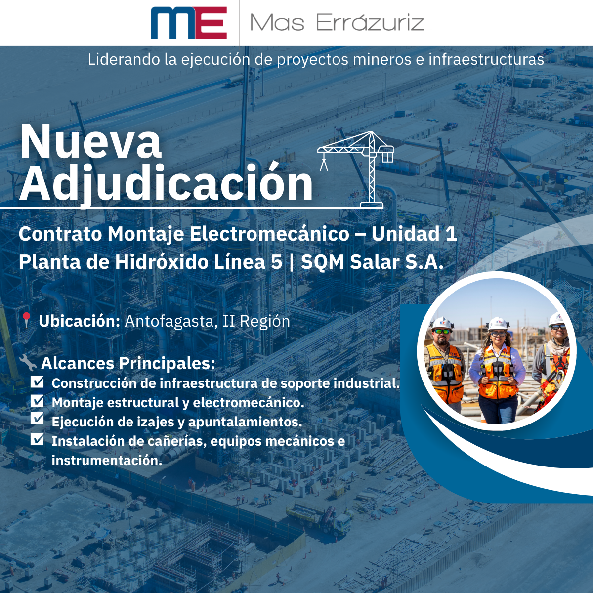 Este contrato reafirma la posición de Mas Errázuriz como un socio estratégico en proyectos de infraestructura crítica para el sector minero y químico, consolidando su trayectoria en montajes industriales de alta exigencia técnica y fortaleciendo su compromiso con la innovación y la eficiencia operativa.
